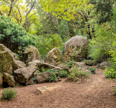center of their land. The camp clearing is bordered by tall, mossy boulders and slender trees, providing privacy and safety. The only way in and out of camp are at opposite ends of the clearing where the rocks are far enough apart that cats may easily pass through.The clearing's floor is covered in dirt and more moss, providing a cool, comfortable place to rest and walk. Ferns and smaller boulders inside the camp's walls line the clearing, allowing cats additional shelter and easy access to hop onto the border walls to survey the surrounding area.